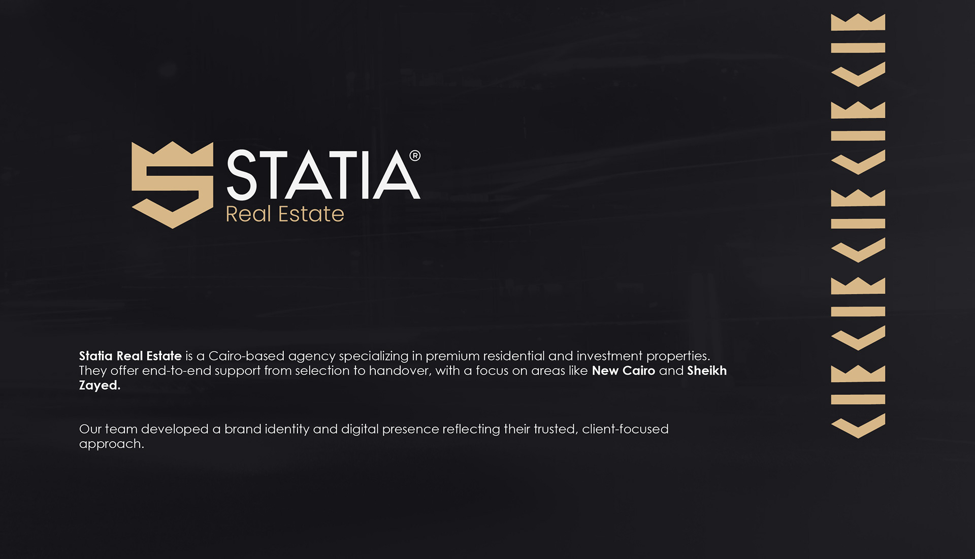 Statia Real Estate is a Cairo-based agency specializing in premium residential and investment properties. They offer end-to-end support from selection to handover, with a focus on areas like New Cairo and Sheikh Zayed. Our team developed a brand identity and digital presence reflecting their trusted, client-focused approach.